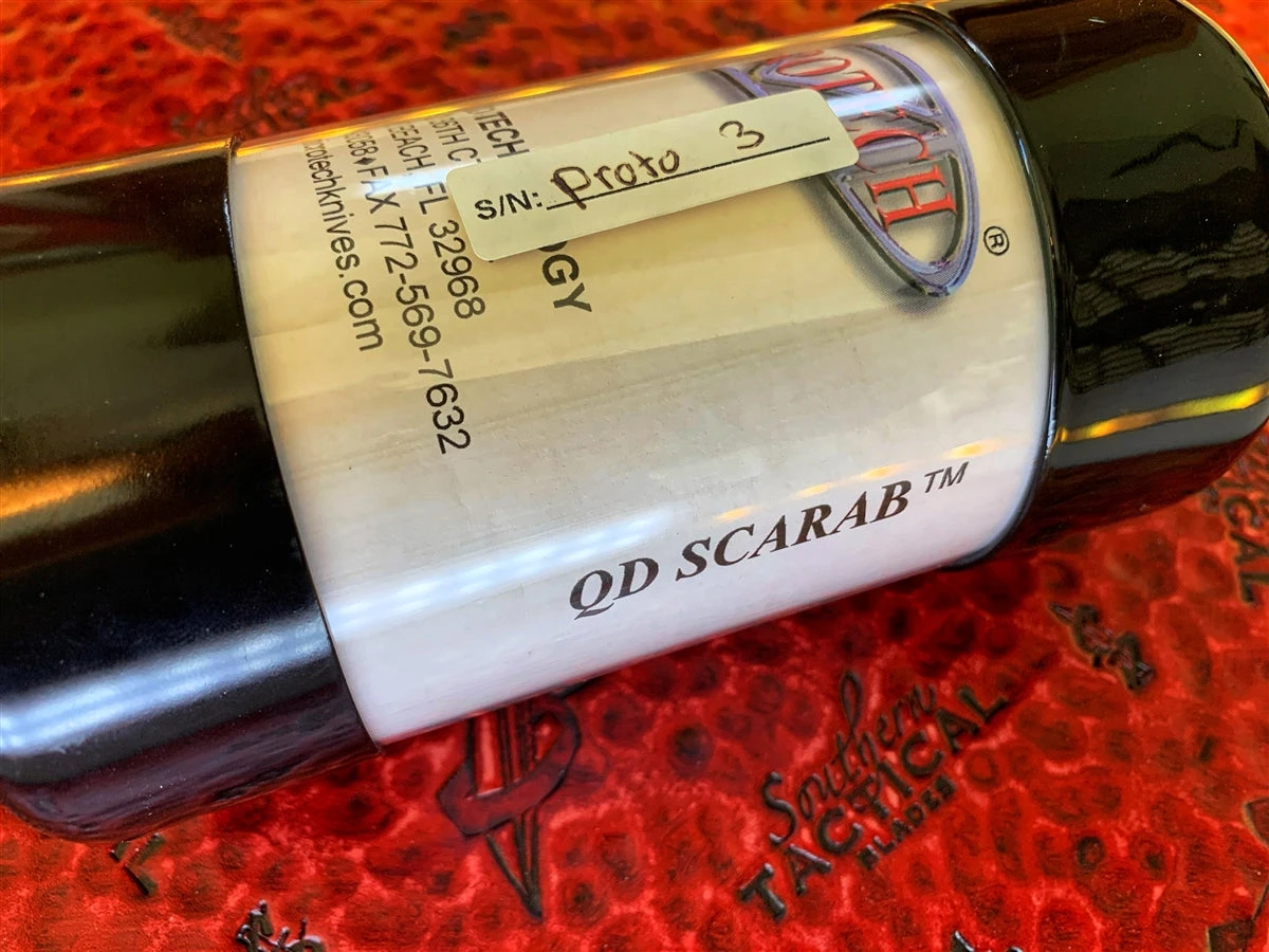 Straight from the personal collection of Tony and Susan Marfione. The Prototype QD (Quick Deploy) Scarab features a hand rubbed satin single edge blade. Anodized chassis with grip tape style inlays. Knife is in 100% Mint condition. Comes with belt pouch, factory container and Orginal documentation.