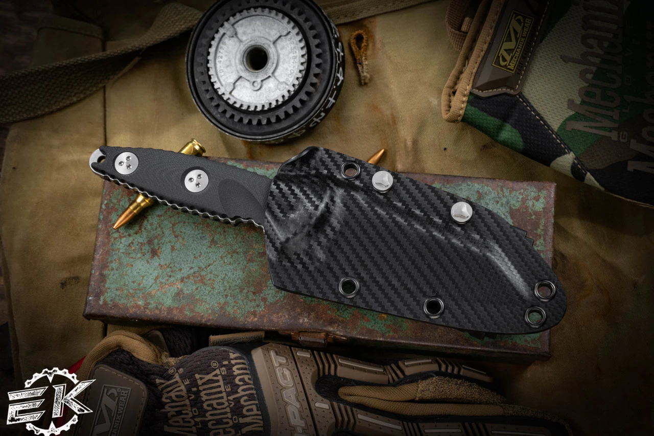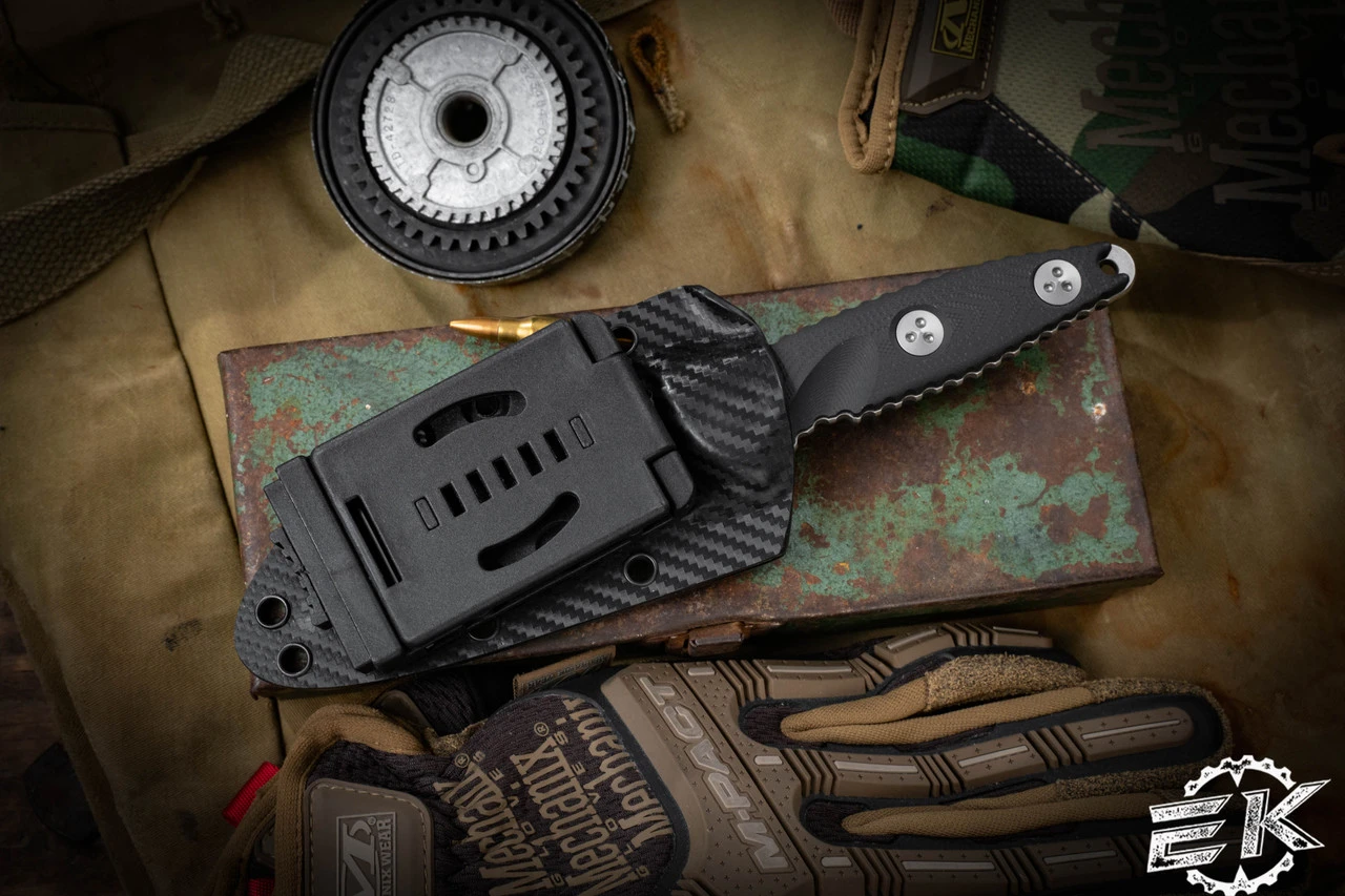 The Microtech Socom Alpha Mini is a fixed blade knife styled after the popular Microtech Socom folder. This fixed blade has a full-tang warcom blade in stonewash finish. The full-tang blade features notches around the edges for a more secure grip. Comes with a kydex Tek Lok sheath in laminate carbon fiber.