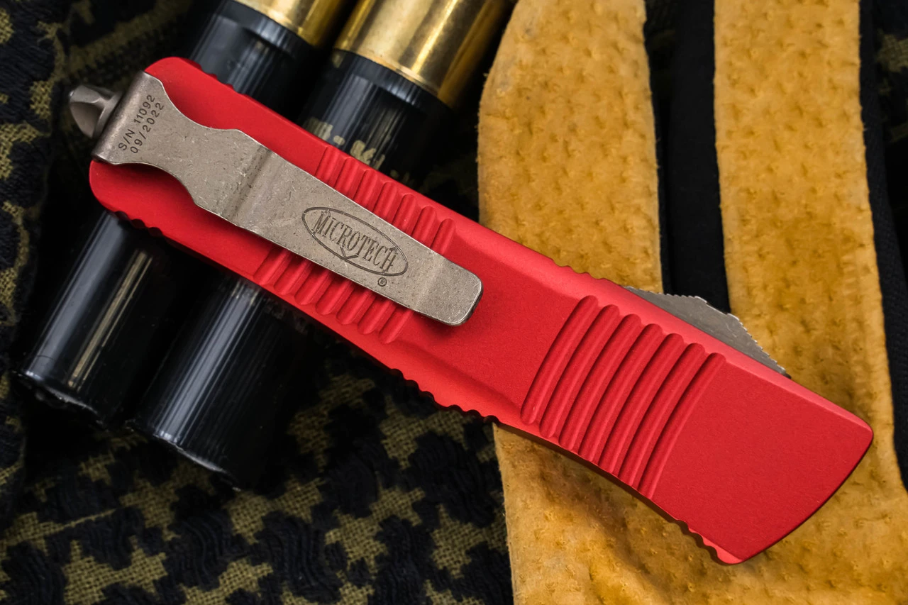 The Microtech Troodon OTF (out the front) automatic knife is named after the Troodon (Troh O Don) Dinosaur and features a double edged dagger style 3″ blade. The Microtech Troodon T6 aluminum handle measures 4.25″ and is a slim fit that works well in the hand.