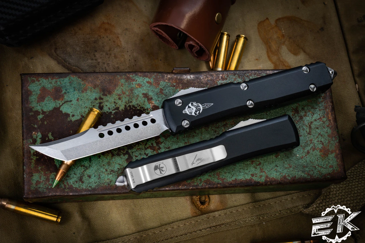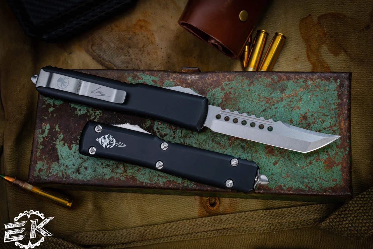 Initially only produced in the Microtech Custom Shop, this is the production version hellhound Ultratech that has been lusted after since its inception in 2016. Designed by Sean Marfione (son of owner Tony Marfione) the hellhound blade has become a staple in the Microtech production lineup. Now get your hands on the one of the most. This Hellhound Tanto Ultratech has a black anodized contour aluminum handle (Sean Marfione Logo) with stainless hardware, pocket clip and glass breaker.
