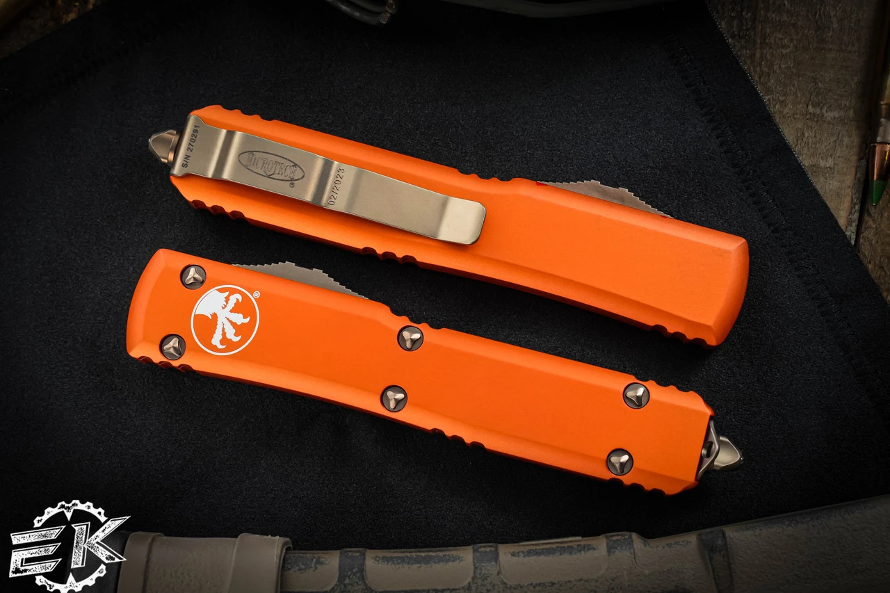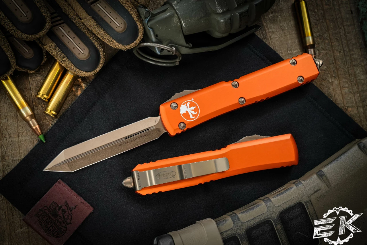 The Microtech Spartan Ultratech handle is making noise in the knife world. The Double Edge Tanto blade is quite appealing and offers a new blade style that could be the norm for MT. The dual action spring loaded OTF that started it all is the smoothest operating out the front knife you will find. It features a 3.4″ Spartan (double edge tanto) blade. The Spartan Ultratech has a 5″ black anodized 6061-T6 aluminum bottom handle with bronze finished pocket clip, glass breaker and hardware.