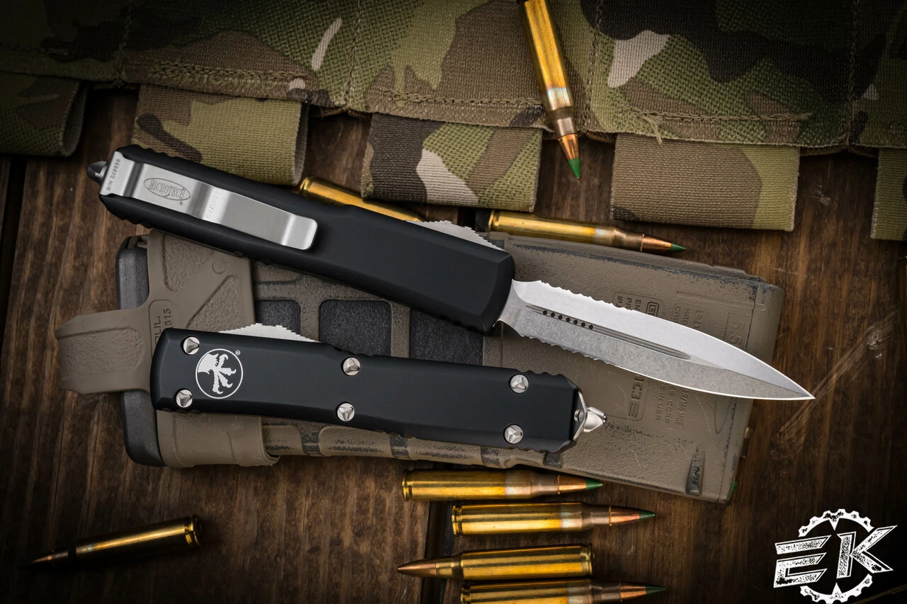 The Microtech Ultratech is the first ever OTF (out the front) automatic knife produced by Microtech Knives. The Ultratech features a 5″ black anodized 6061-T6 aluminum handle with bead blast finished pocket clip, glass breaker and stainless steel hardware. The Ultratech OTF automatic features a double edge dagger blade. The OTF knife fires via a double action thumb slide on the side of the handle for automatic deployment and retraction with the push of the slide.