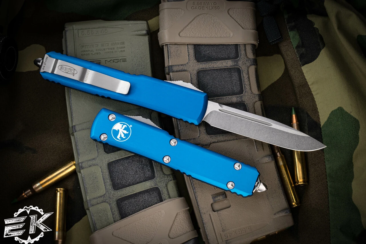 The Microtech Ultratech is the first ever OTF (out the front) automatic knife produced by Microtech Knives. The dual action automatic that started it all is the smoothest operating out the front you will find. It features a 3.4″ blade. The Ultratech has a 5″ anodized 6061-T6 aluminum smooth handle with bead blast finished pocket clip, glass breaker and stainless steel hardware. The double action slide switch allows for fast automatic deployment and retraction when you need it. The slim design of the Ultra make it the perfect EDC knife.