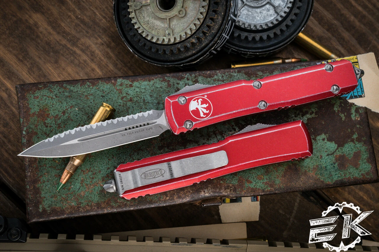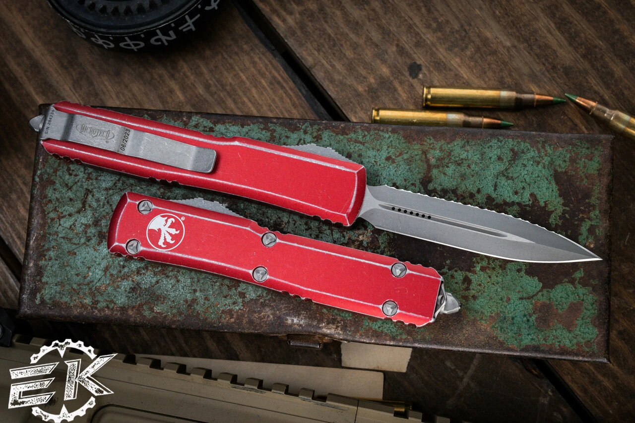 Microtech Ultratech OTF Automatic Knife Distressed Red 3.4″ Dagger Stonewash Serrated 122-12DRD