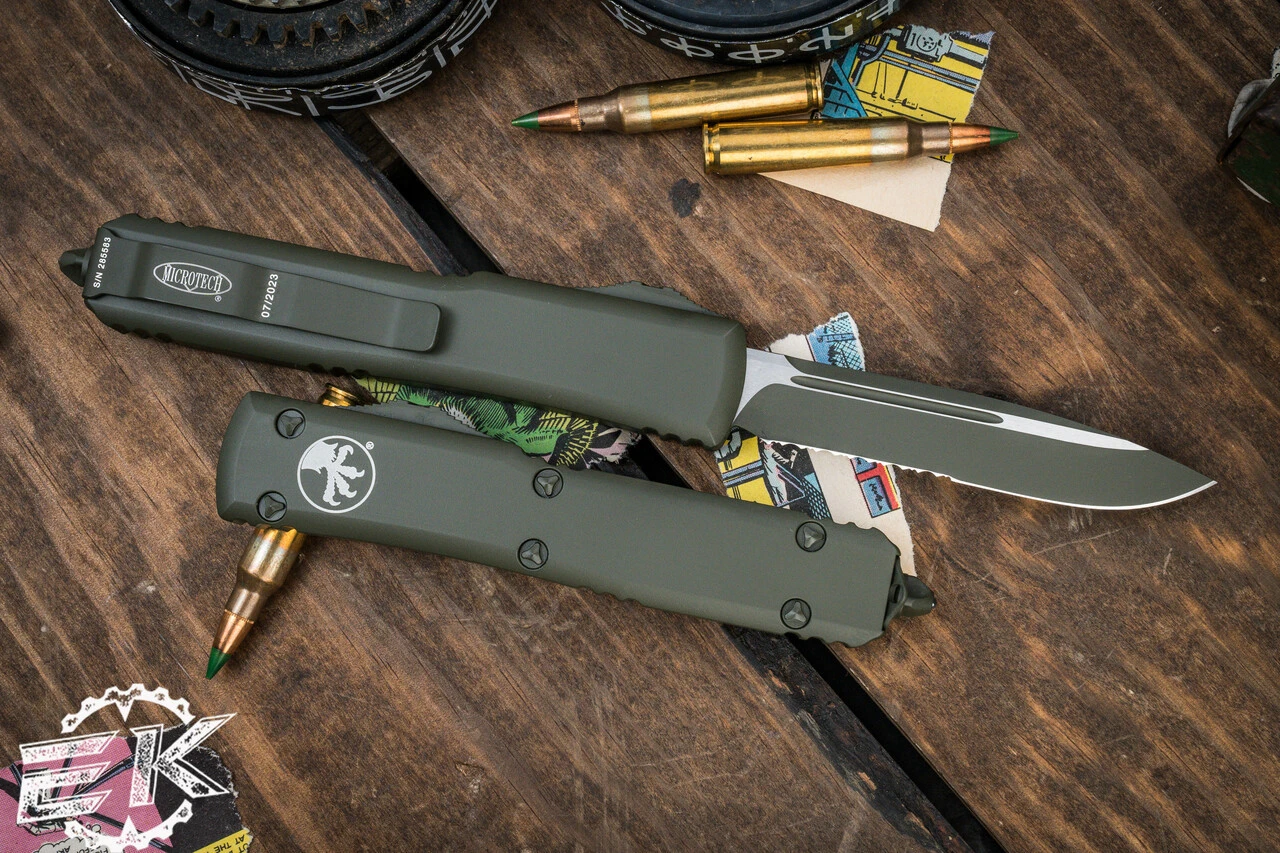 - Blade: 3.4″ Drop Point, Part Serrated, OD Green Cerakote