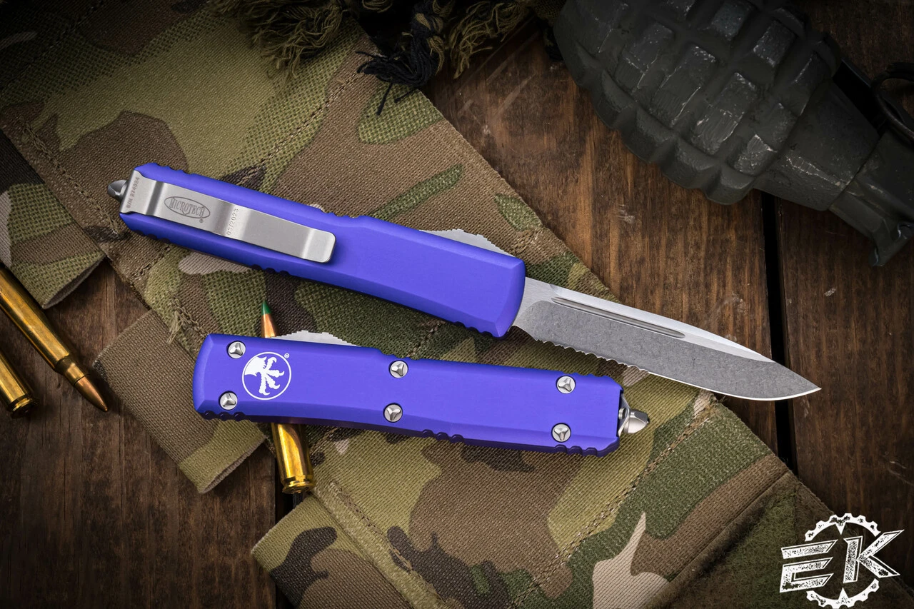 As the flagship model of Microtech’s OTF lineup, the Ultratech® sets the standard for OTF technology. Proprietary technology allows the firing spring to be at rest in both the open and closed positions, drastically reducing wear on the internal firing mechanisms. The contoured chassis handle provides a lighter and more ergonomic feel and comes in a smooth, flat finish.The Microtech Ultratech is the first ever OTF (out the front) automatic knife produced by Microtech Knives. It features a 3.4″ blade with various blade finishes and styles. The Ultratech features a 5″ anodized 6061-T6 aluminum smooth handle with pocket clip, glass breaker and stainless steel hardware. Dual action thumb slide for automatic deployment and retraction.