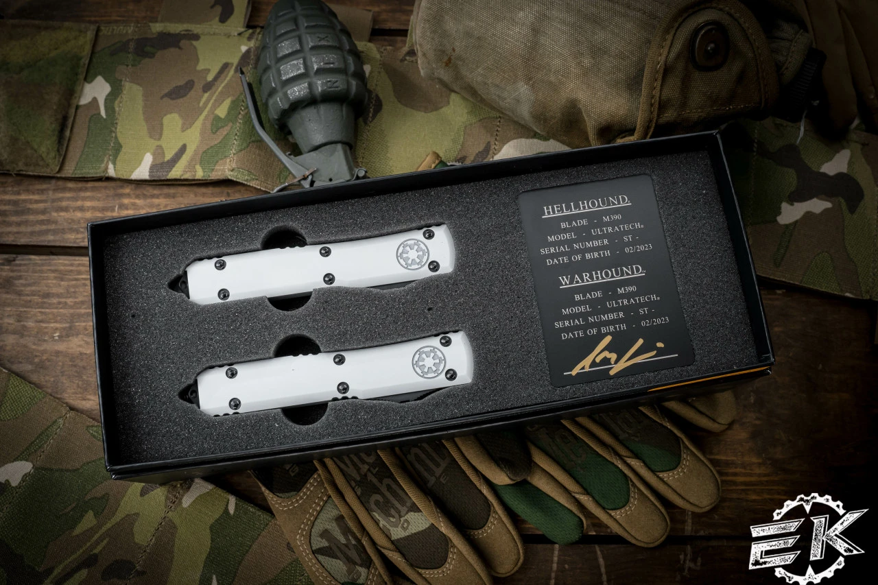 - Blade: 3.4″ 1 Hellhound, 1 Warhound; White Cerakote