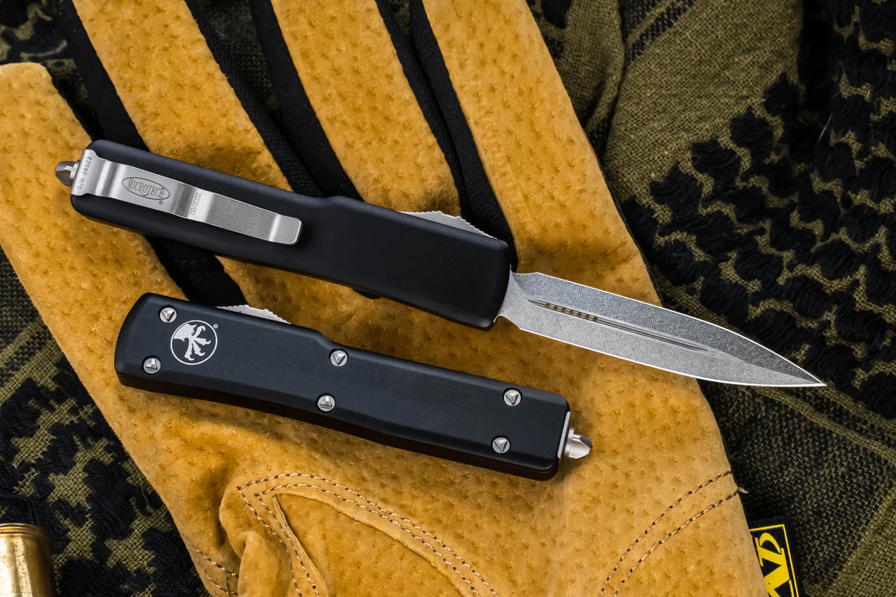 Who said size doesn’t matter? The Microtech UTX-70 is one of the smallest OTF (out the front) automatics on the market. At 70% the size of the Ultratech (hence the name), Microtech’s smallest OTF knife, the UTX-70 has the same simplistic design and internal spring mechanism that has powered its entire line for decades. The spring remains “at rest” until the blade is deployed ensuring it fires effectively every time. The black anodized aluminum handle measures just over 3 inches long and features bead blast hardware, pocket clip and auto firing slide switch on the side. The slide switch deploys and retracts the OTF rapidly with one push making it a perfectÌ´Ì_EDC OTF knife. The Microtech UTX-70 OTF auto features a 2.4″ double edge dagger blade with a stonewash finish. The UTX 70 auto is perfect sized for the hand and pocket.