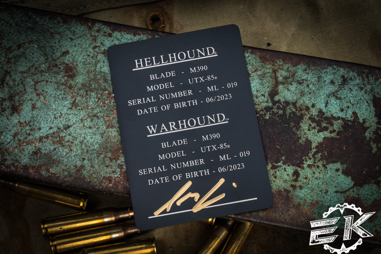 - Blade: 3.1″ M390, 1-Warhound, 1-Hellhound, Bronze