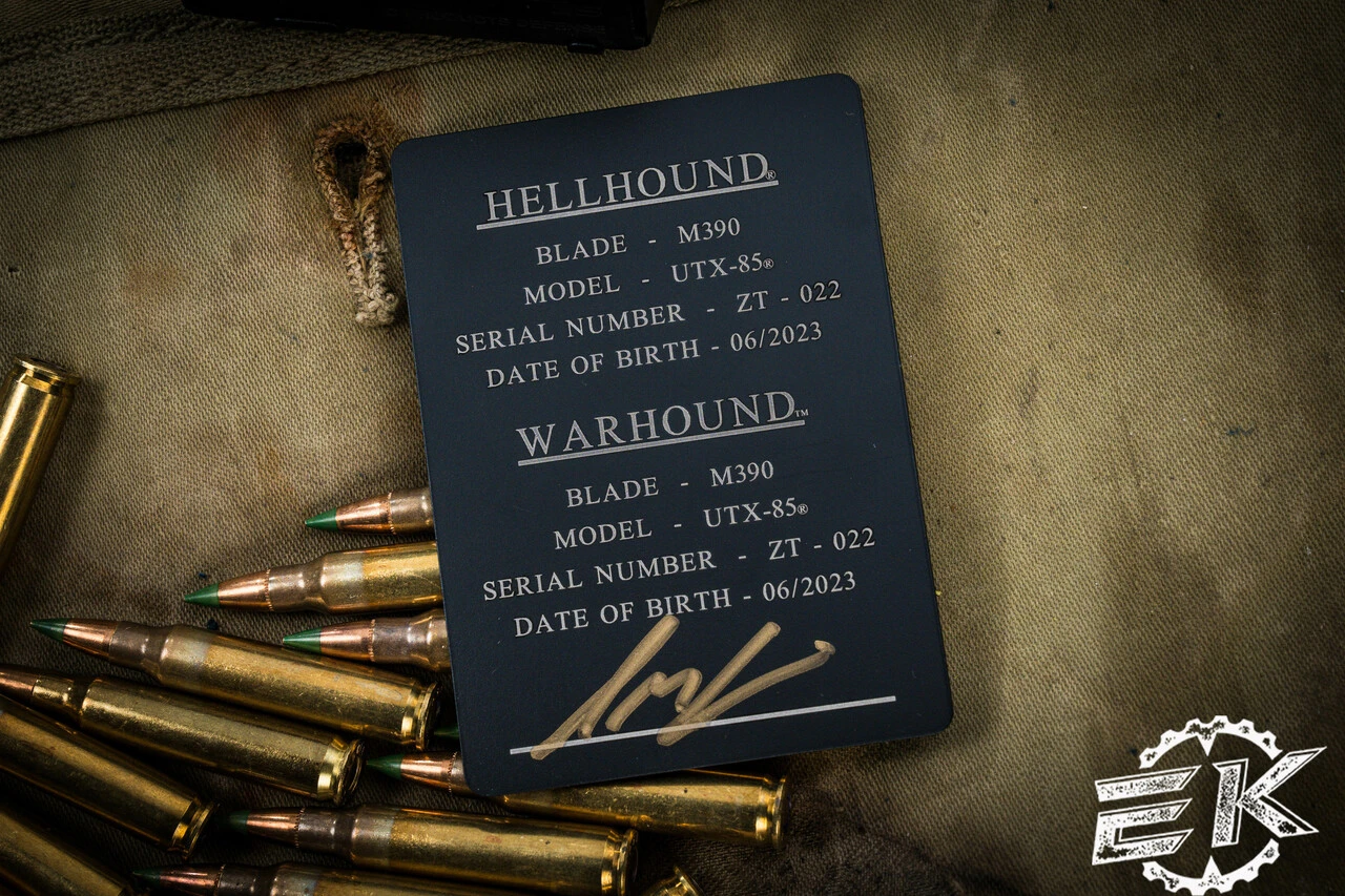- Blade: 3.1″ M390, 1-Warhound, 1-Hellhound, Stonewash