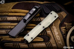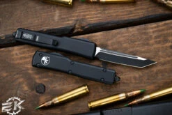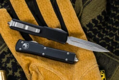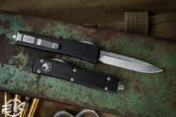Microtech UTX-70 Distressed Merlot Red OTF Knife 2.4″ Dagger Double Serrated Stonewash 147-D12DMR