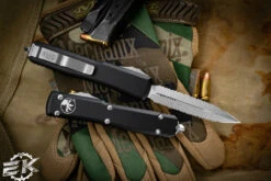 Microtech Ultratech OTF Automatic Knife Black 3.4″ Dagger Stonewash Serrated 122-11